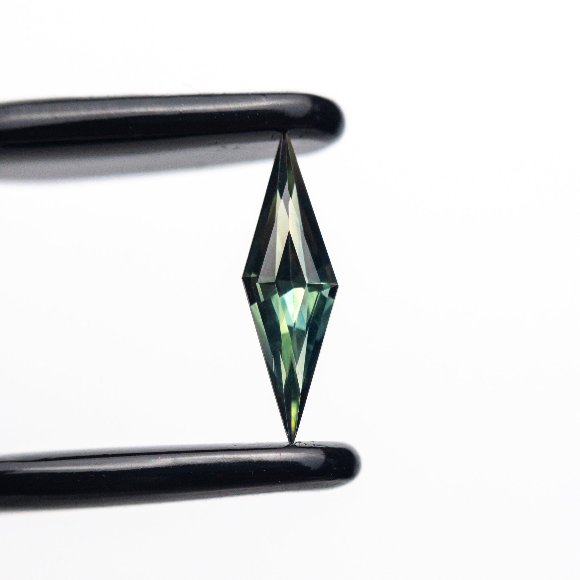 This 0.46ct heat-treated Australian sapphire, masterfully lozenge step-cut by Misfit Diamonds, displays a deep, rich green hue with exceptional clarity and brilliance. Measuring 9.84 mm x 3.97 mm, its striking geometric shape makes it an ideal choice for a bold and eye-catching ring. While this sapphire does not come with a certificate, a GIA report can be ordered separately under the listing "GIA Colored Stone Report."