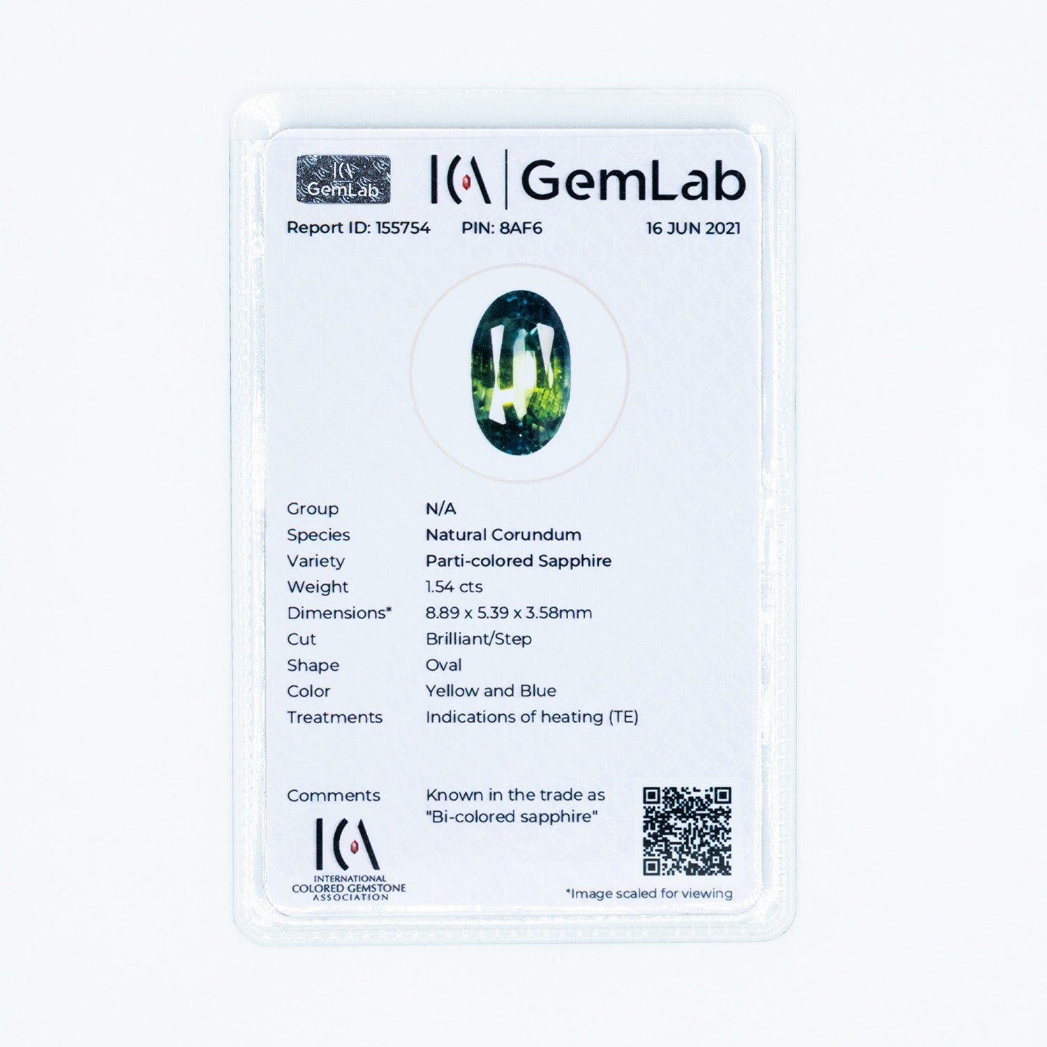 This 1.54ct heat-treated Australian sapphire boasts a vivid blue-yellow parti-color, creating a striking contrast that makes it truly unique. With VS clarity, it offers impressive brilliance and a clean appearance. Measuring 8.89 mm x 5.39 mm, its balanced proportions make it perfect for fine jewelry. Accompanied by a certificate from International Colored Gemstone Association (ICA), this ethically sourced sapphire is a rare and exquisite gem for collectors and connoisseurs alike.