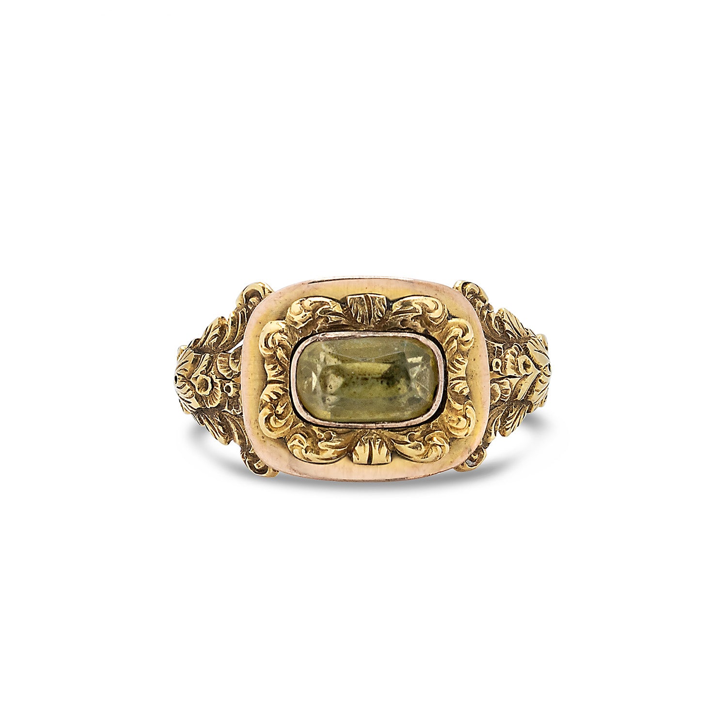 A rare and remarkable piece of history, this antique ring is signed and dated by its original maker: Thor Pritchard, 06 12 May, 1829 Oct. 31. At its center rests a luminous green chrysoberyl, foil-backed to enhance its glow—a technique typical of the period. To preserve the integrity of the stone, it is recommended that the ring be removed before exposure to water, as moisture may darken the foil backing over time. The band features beautifully intricate detailing, showcasing the craftsmanship of the early 19th century. Currently a size 9.75, this piece is best left unaltered to maintain its original condition and historical value.