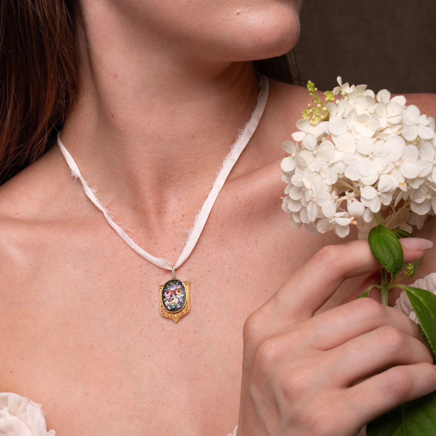 A delicate work of art from the Victorian era, this 18k gold pendant features an intricate micro mosaic depicting a bouquet of flowers in remarkable detail. Crafted with tiny hand-set glass tesserae, the piece showcases the extraordinary craftsmanship of the 19th century. Though a few glass shards are missing due to age, the pendant remains in good condition overall—especially considering its 150-year history. A soft natural patina further enhances its antique charm, making it a truly special collector's piece.