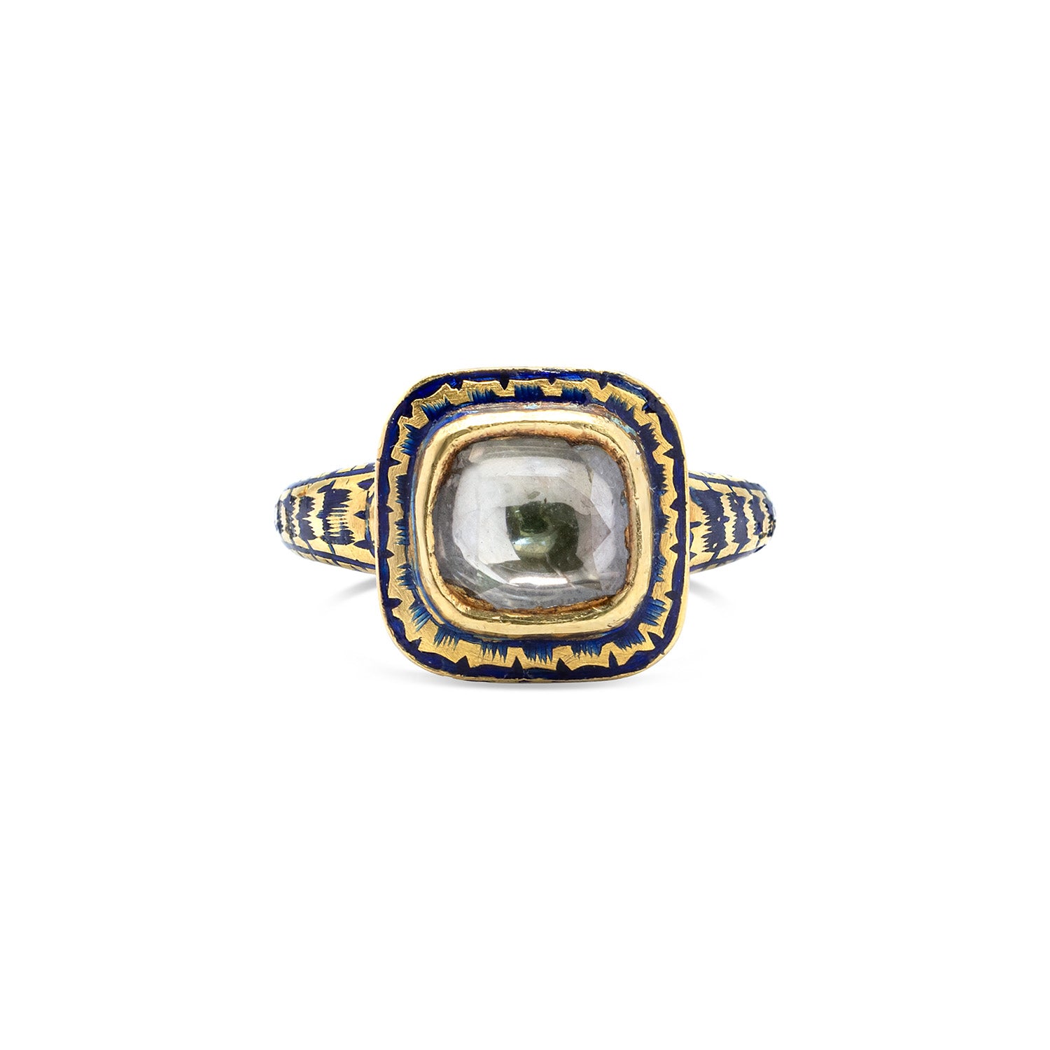 Handcrafted in India between 1930 and 1950, this exquisite ring features a rose-cut, foil-backed diamond with a visual spread of approximately 2 carats. Set in richly hued 20–22k gold, the ring is adorned with intricate dark blue enamel detailing that showcases the beauty of traditional Indian craftsmanship. The contrast between the luminous diamond and vibrant enamel makes this piece both striking and timeless. Currently a size 5 1/2, and recommended to be kept as-is to preserve its original condition.