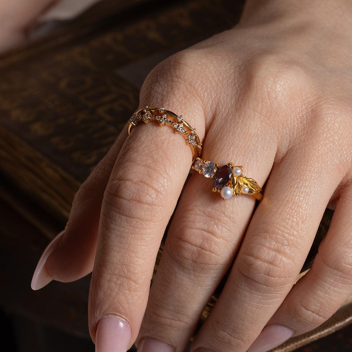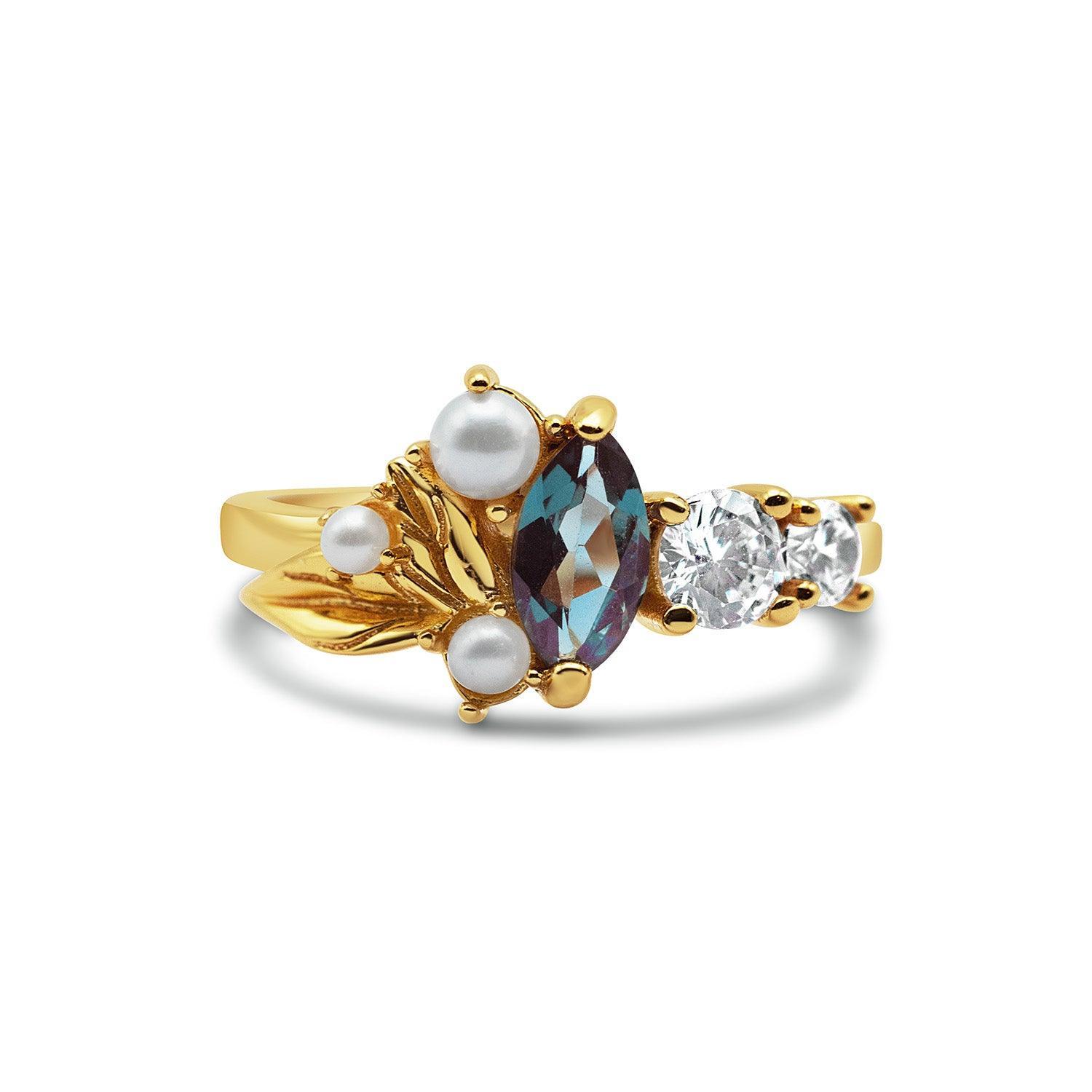 Indulge in the luxurious Alexandria Ring, inspired by the Egyptian city. This opulent 18K Gold Vermeil piece boasts a stunning lab alexandrite at its center, complemented by natural freshwater pearls and a delicate leaf motif. A flawless embodiment of Cleopatra and her magnificent city.