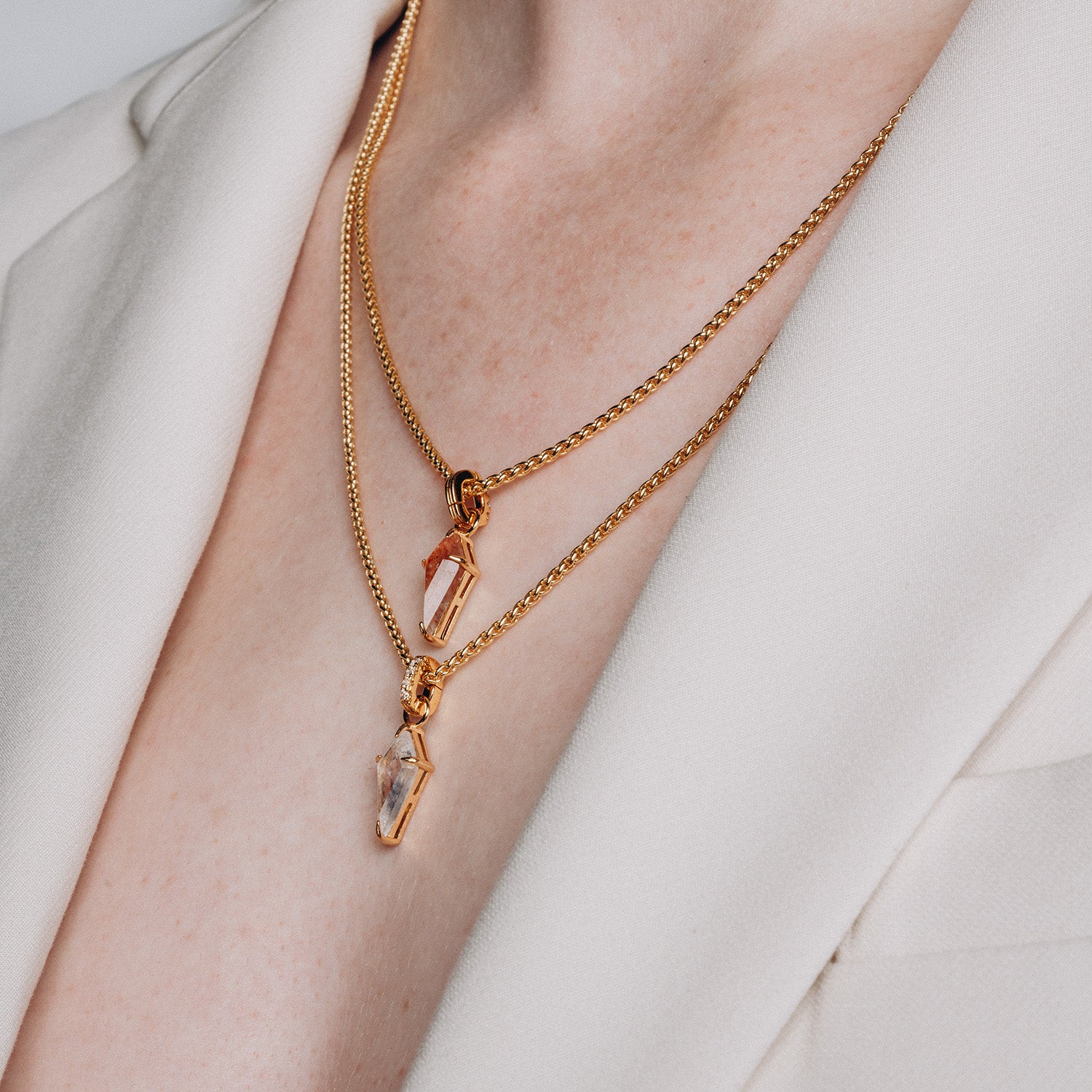 Celebrate the beauty of transition with our Dusk til Dawn Pendant Necklaces, designed to embody the shift from night to day. Featuring genuine moonstone and sunstone, these radiant charms capture the quiet glow of the moon and the first light of dawn. Crafted in your choice of 18k gold vermeil or sterling silver, this versatile piece offers two looks in one—the rotating bail allows you to switch between a row of crystals or a lined texture for effortless styling. Suspended from a bead-adjustable wheat chain (up to 55cm), it’s perfect for layering and creating your ideal stack.