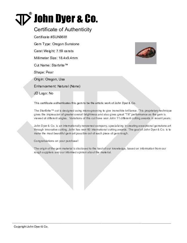 1 in stock and ready to ship. Gem comes with certificate issued by John Dyer.