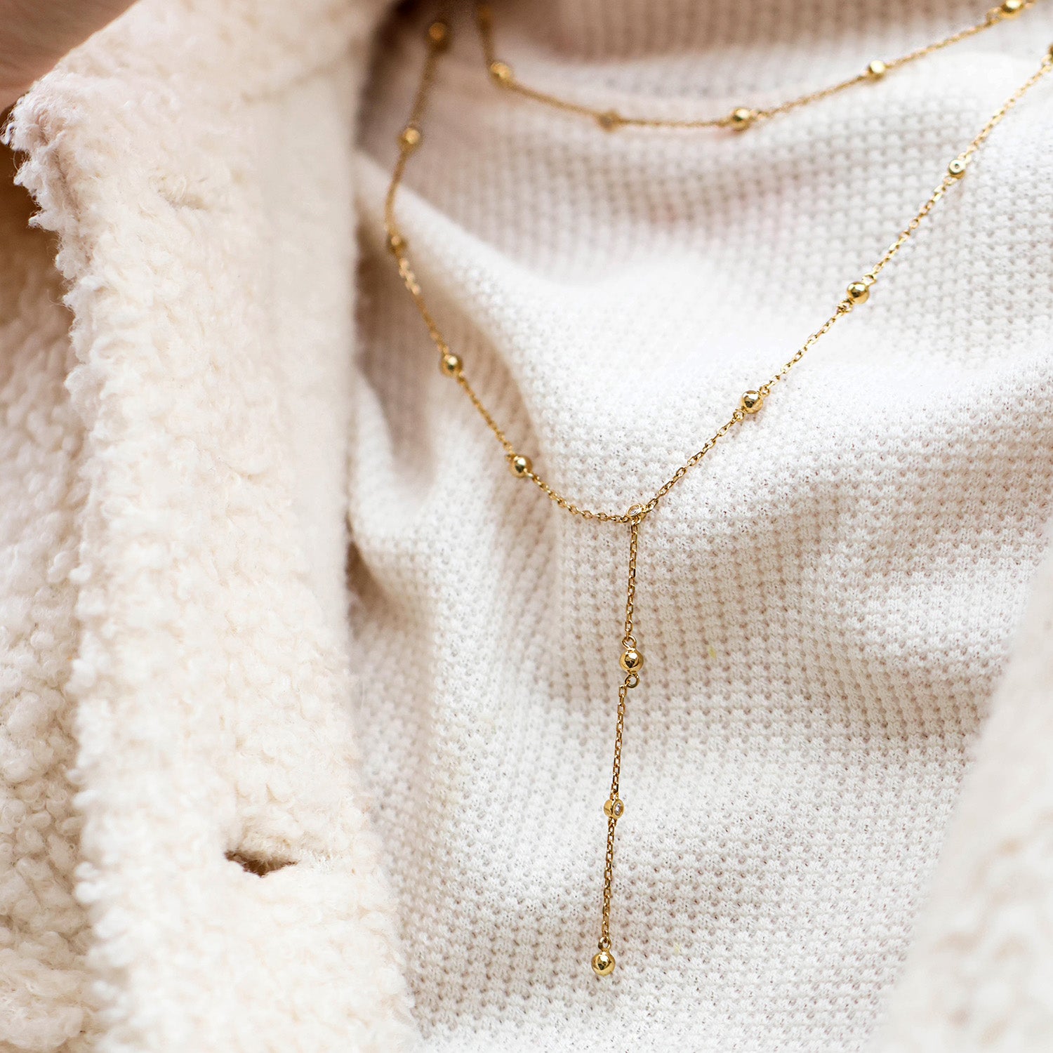 Introducing the Beaded Satellite Layered Lariat Necklace, your go-to accessory for effortless style. Featuring a delicate beaded drop chain and adjustable length, this necklace allows you to effortlessly create a chic, stacked look with no effort required. Upgrade your style with this versatile piece.
