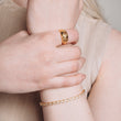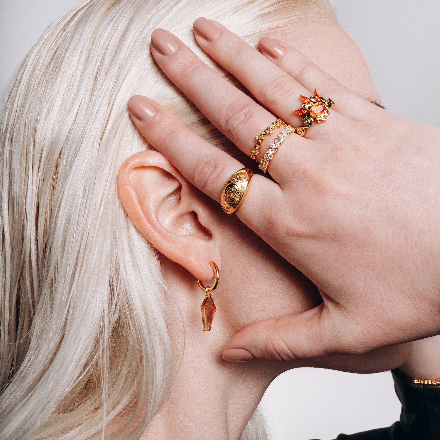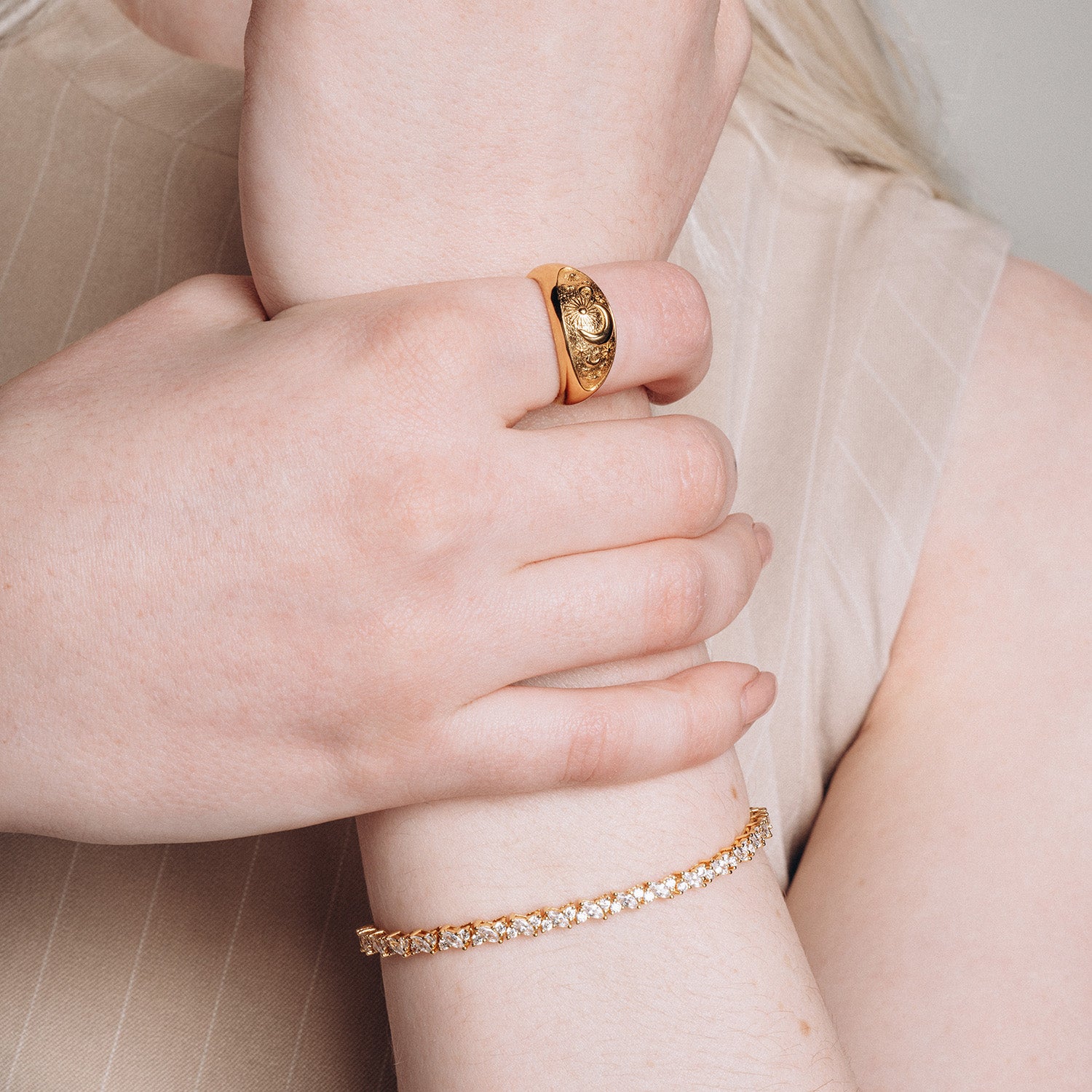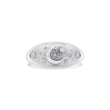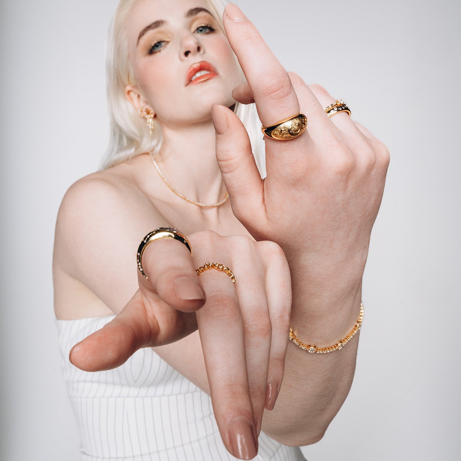 A tribute to the celestial dance of the cosmos, the Ecliptica Ring features an intricate textured design of crescent moons, stars, and suns, capturing the beauty of the ever-changing sky. Its chunky silhouette makes a bold yet wearable statement, perfect for everyday styling. Crafted in 18K gold vermeil or 925 sterling silver, this radiant piece shimmers with cosmic energy. Whether stacked or styled solo, the Ecliptica Ring is a striking addition to any jewelry collection.