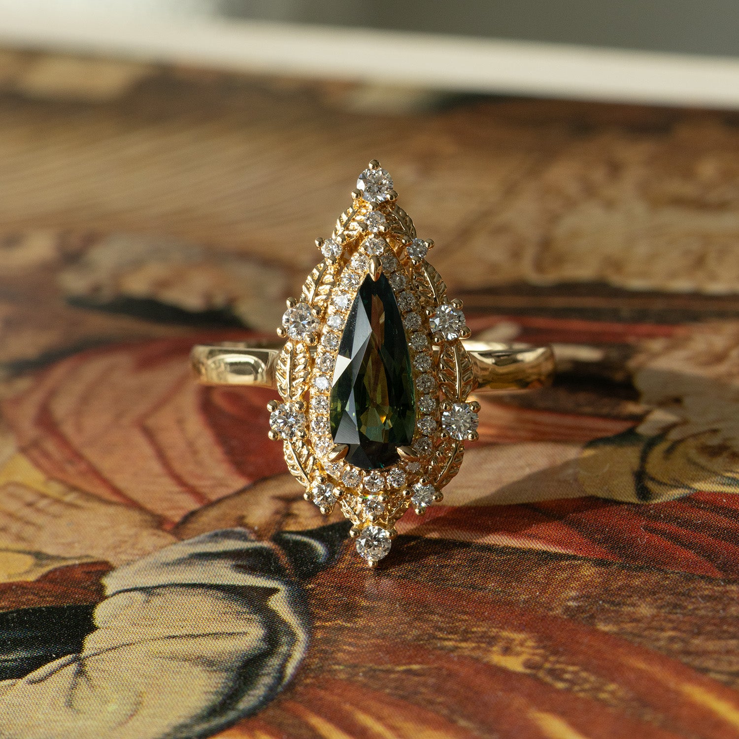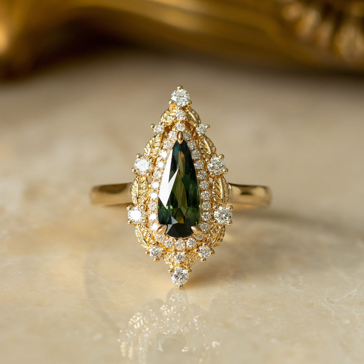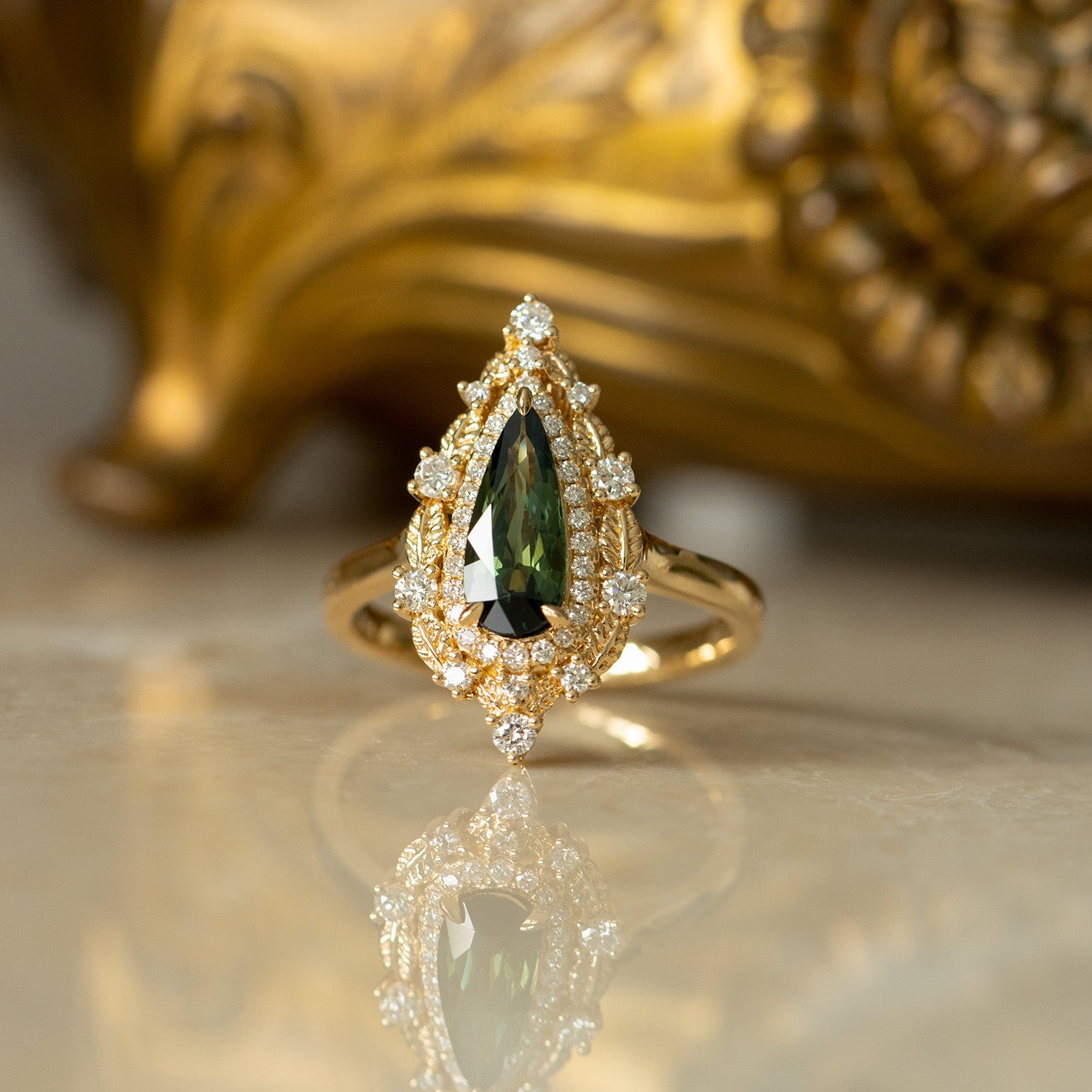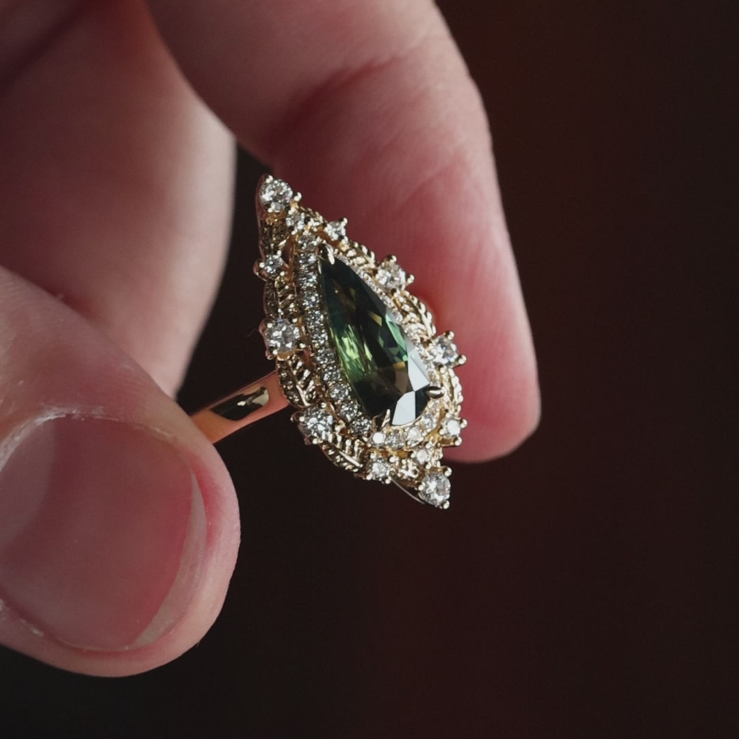 The Faelyn Ring is crafted in rich 18K gold and designed to echo the quiet power of the forest. At its center is a 1.40ct heat-treated green sapphire from Australia, cut by Misfit Diamonds, showcasing a medium-dark green tone with hints of blue.