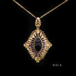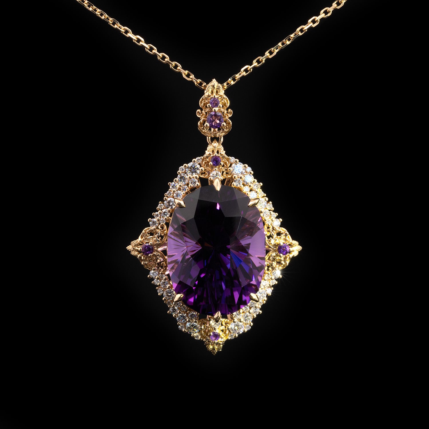 The Guinevere Necklace is a statement of quiet power and romance, designed to feel like a relic from another time. Crafted in rich 18k gold, it showcases a mesmerizing 29.36ct untreated amethyst from Bahia, Brazil, expertly cut by John Dyer & Co. in a Regal Radiant™ Cut. The stone glows with depth and movement, framed by additional amethysts and approximately 1.165cts of natural diamonds (G color, SI1 clarity), along with intricate acanthus scrollwork that draws inspiration from medieval artistry and the timeless elegance of old-world design.