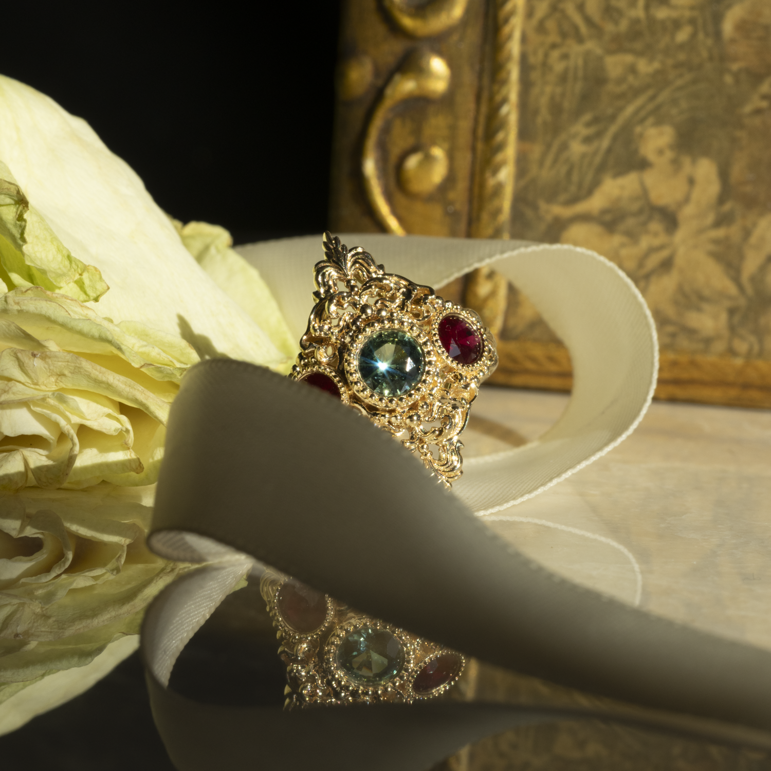 The design draws inspiration from medieval motifs with graceful curves, symbolic color pairings, and a silhouette that feels like a relic from a long-forgotten tale.