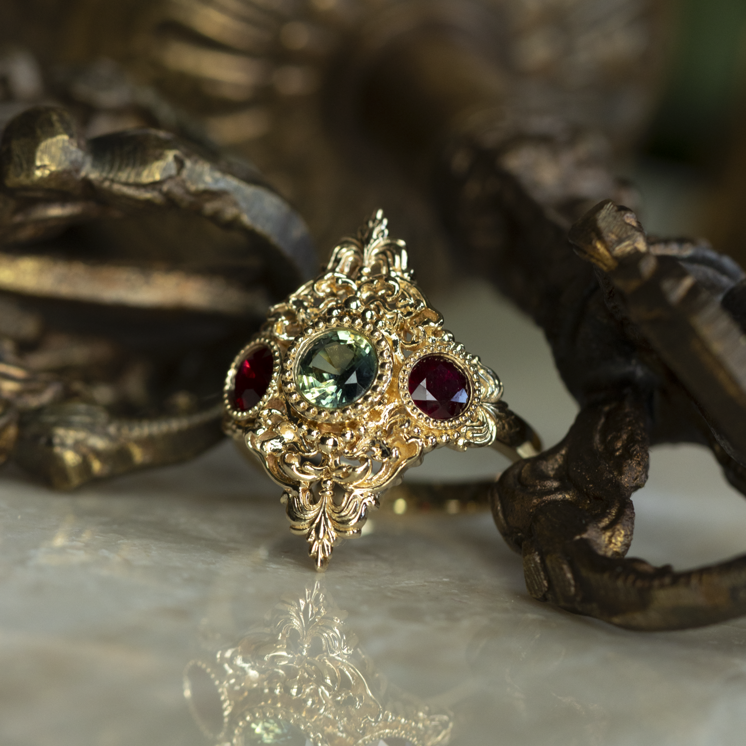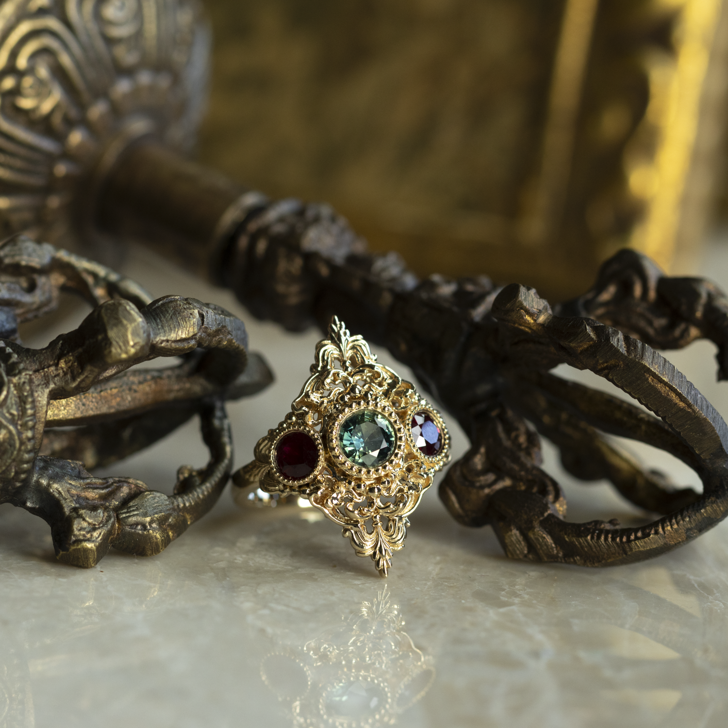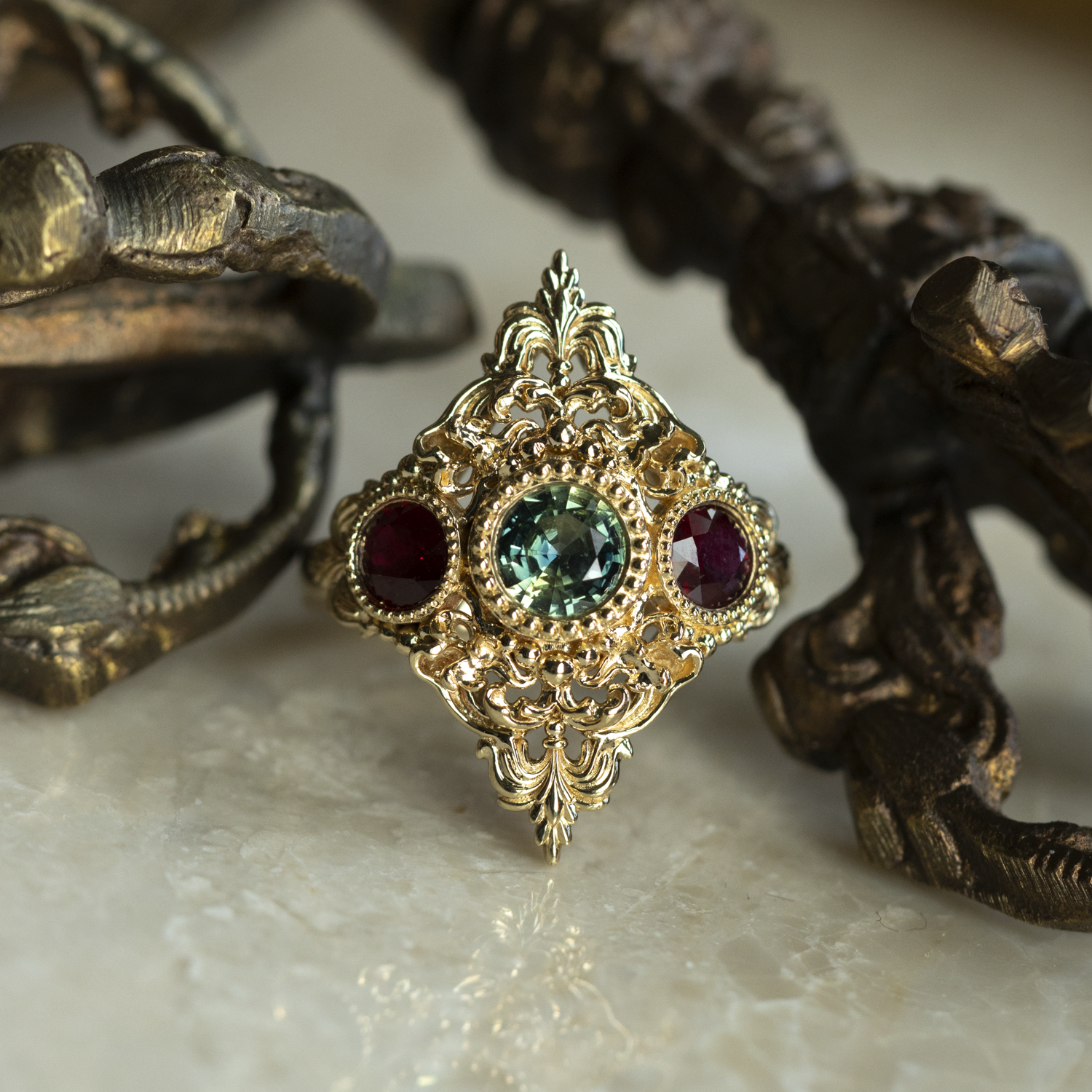The Isolde Ring is a tribute to medieval romance and timeless artistry, crafted in 14k gold and centered around a mesmerizing 0.70ct untreated blue-green parti sapphire from Australia.