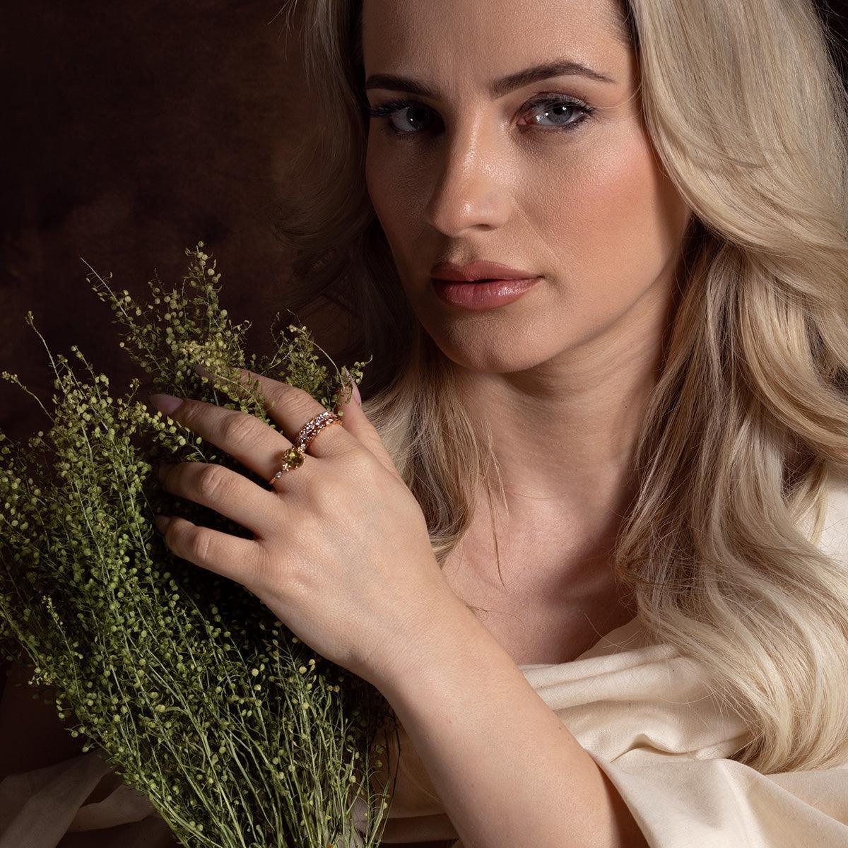 The Florence Peridot Rose Ring is a stunning botanical-inspired piece that exudes elegance and enchantment. A natural peridot stone sits at the center, surrounded by delicate rose gold roses, creating a captivating and opulent design. This ring is the perfect accessory for any woman looking to add a touch of enchantment to her look.