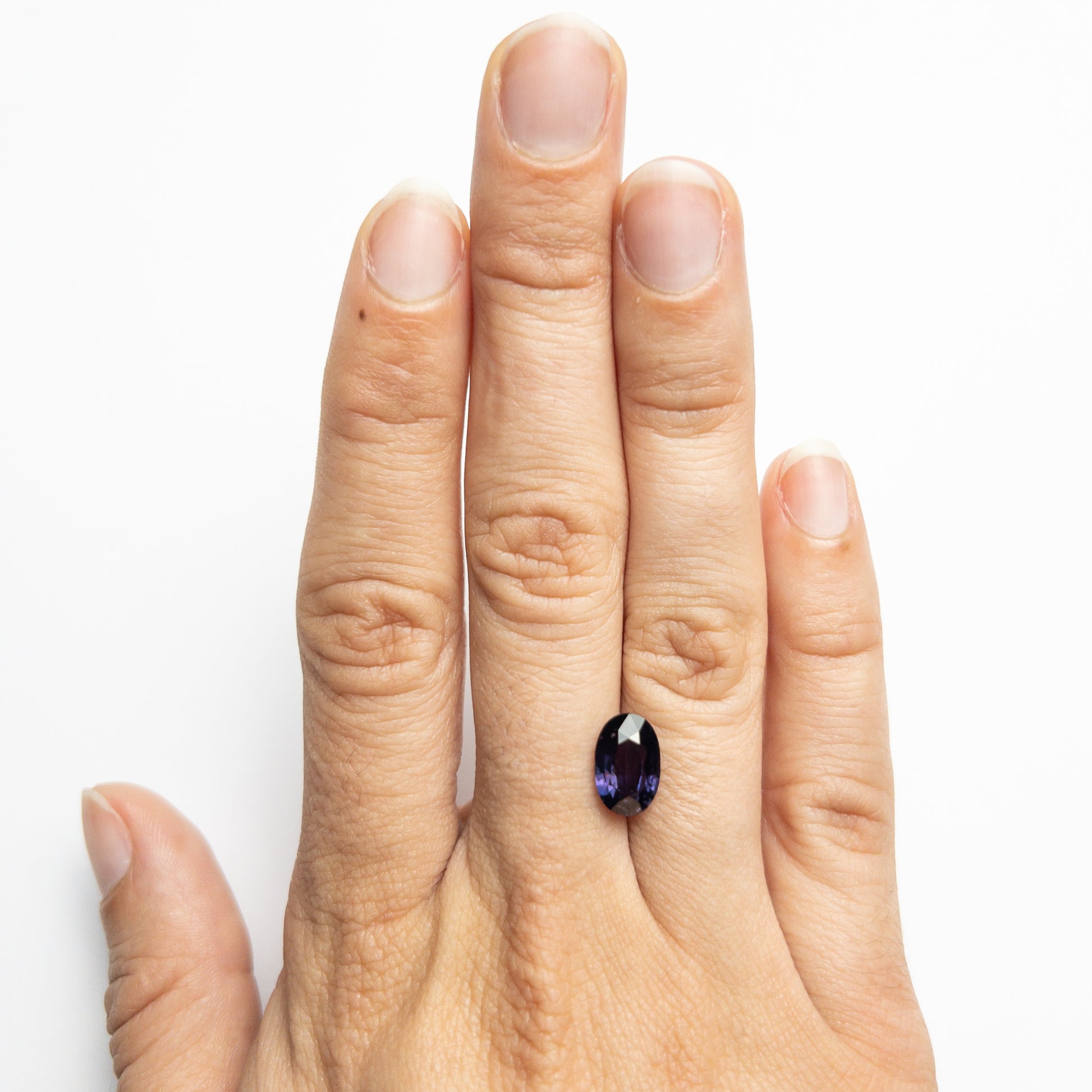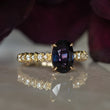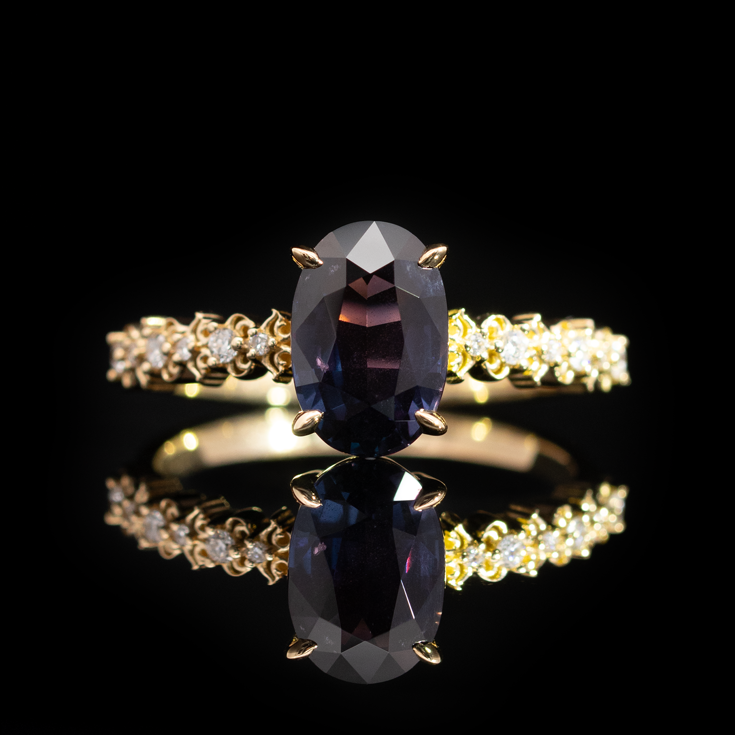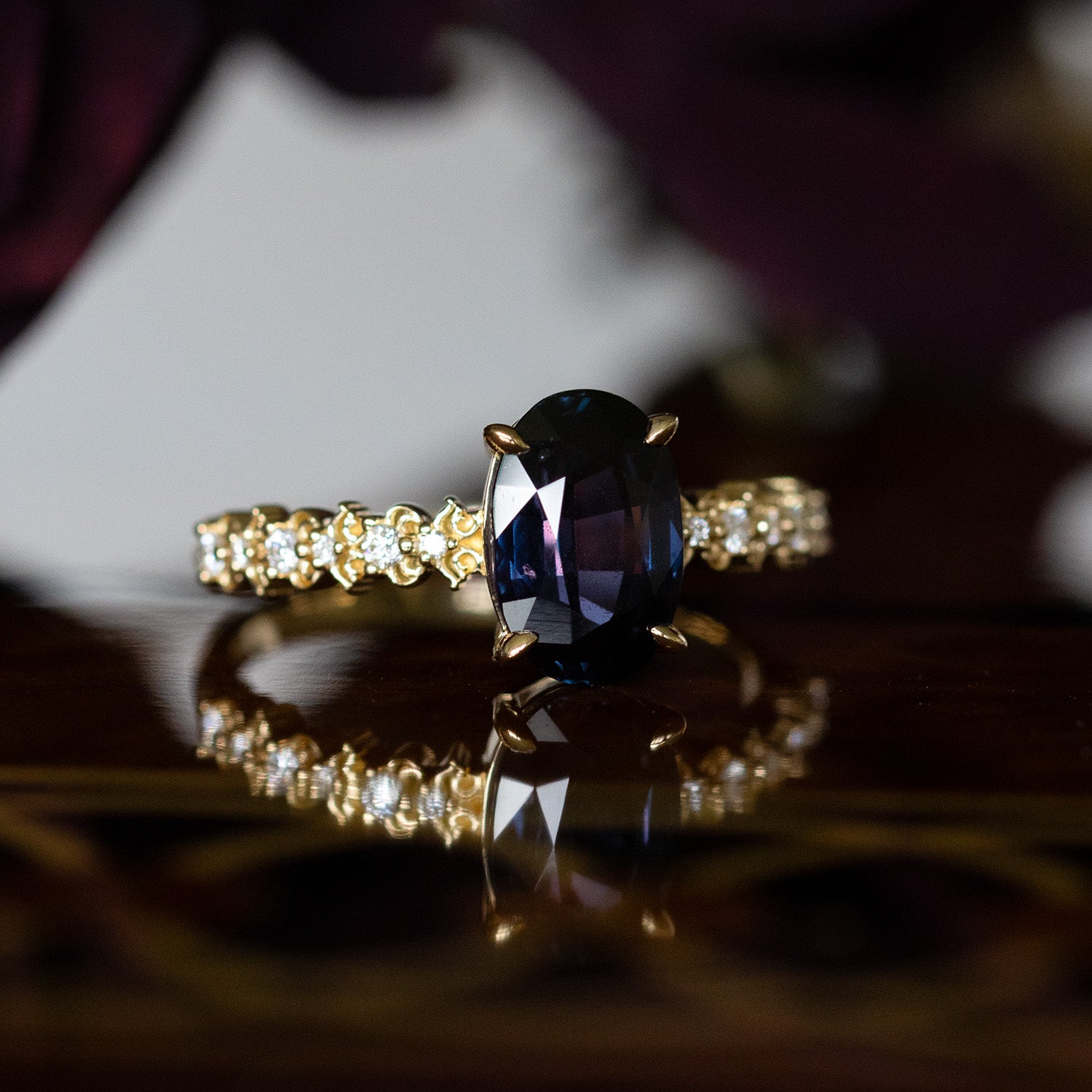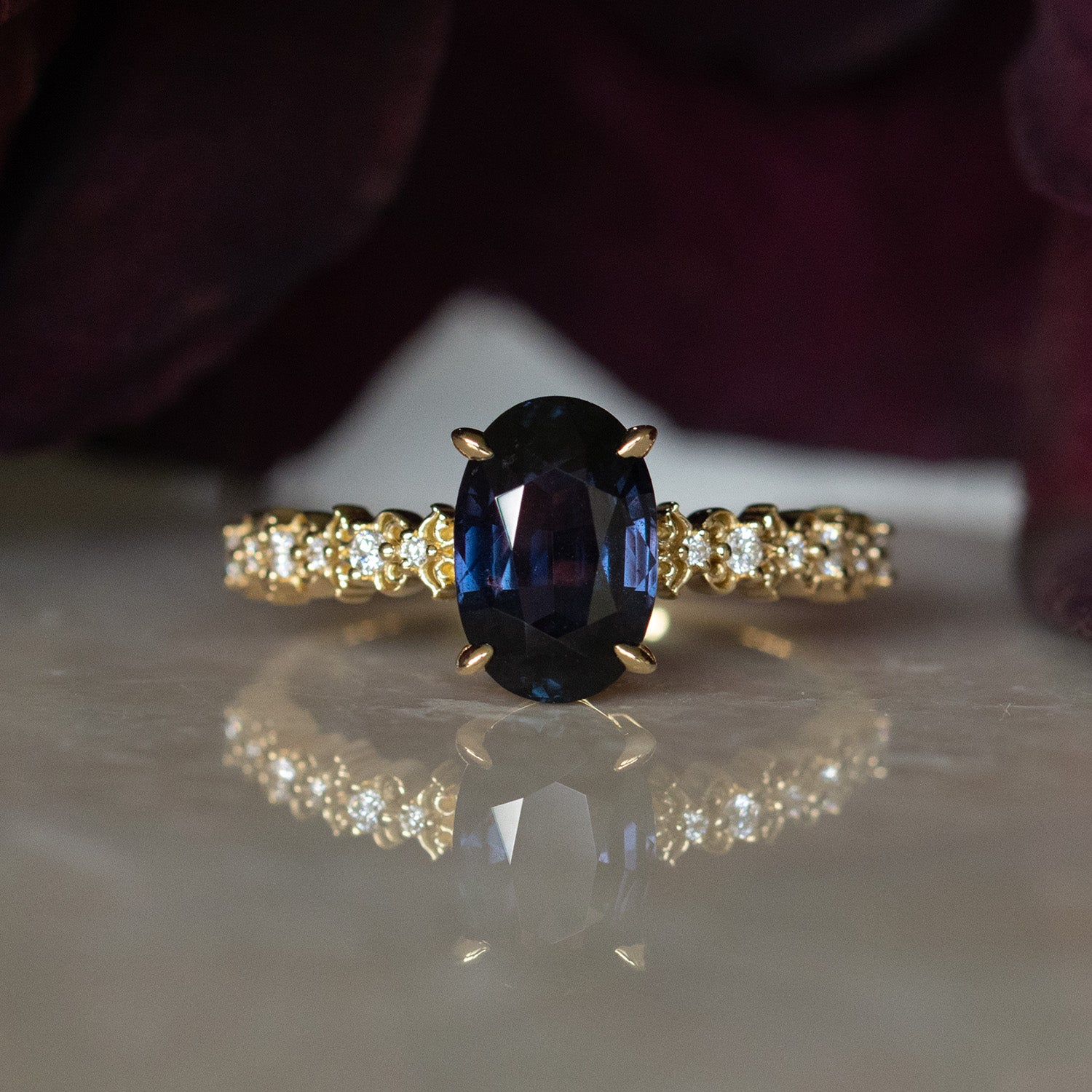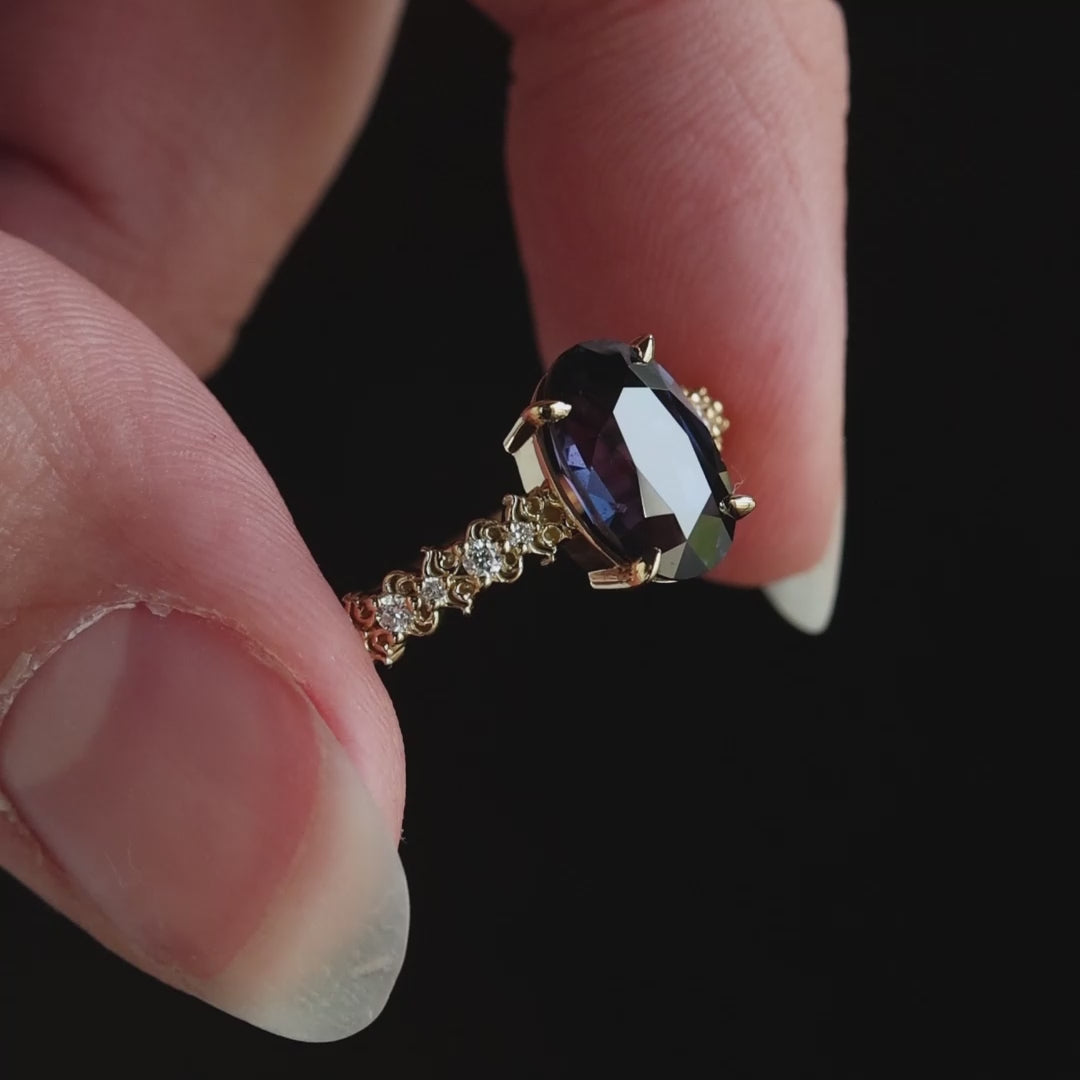At the center of this 18k gold ring is a 2.98ct natural, untreated purple sapphire from Umba Valley, Tanzania, sourced from Moyo Gems, a women-led artisanal mine-to-market initiative, and cut by Misfit Diamonds. It displays a deep violet body color, accented by approx. 0.11cts total of natural diamonds (G color, SI1 clarity) and delicate filigree scrollwork inspired by antique designs. This ring is ready to ship in a size 8 or can be resized with a 1–2 week lead time.
