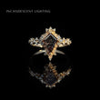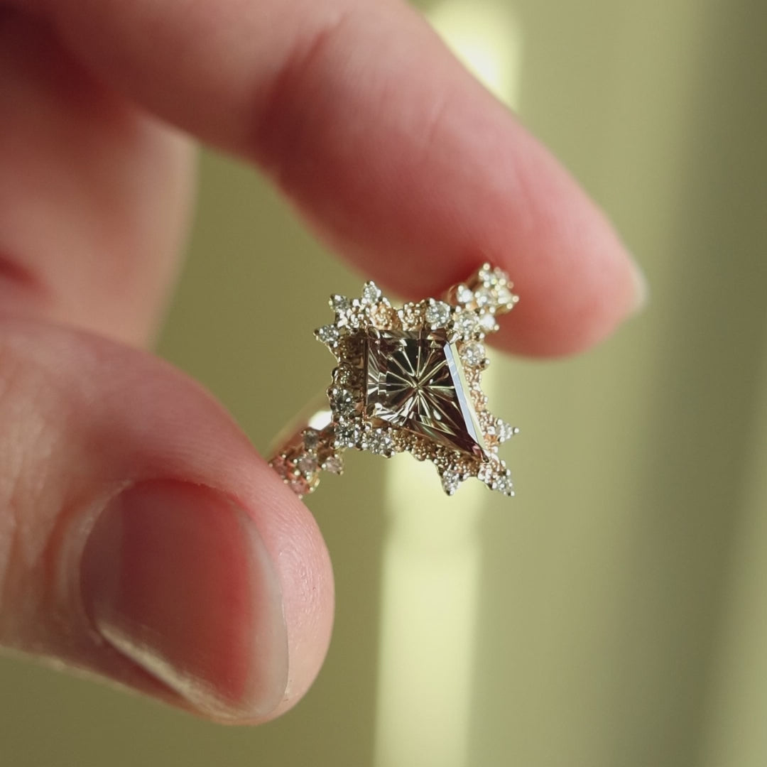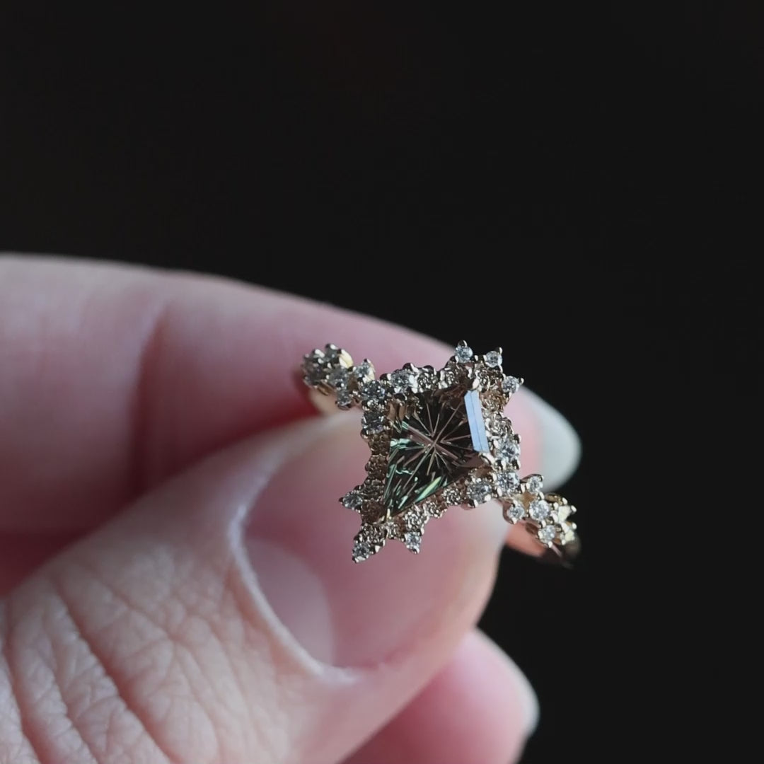 At the center of this 14K gold ring is a 1.47ct natural, untreated color-change garnet from East Africa, cut by John Dyer & Co. in a StarBrite™ cut. The gemstone shifts from green to pinkish purple with teal, appearing green under fluorescent light and pinkish purple in incandescent light. Sculpted peony motifs and lab diamond accents frame the stone, evoking an ethereal garden with a timeless, regal presence. This ring is ready to ship in a size 7 or can be resized with a 1–2 week lead time. Includes certificate issued by John Dyer & Co.