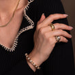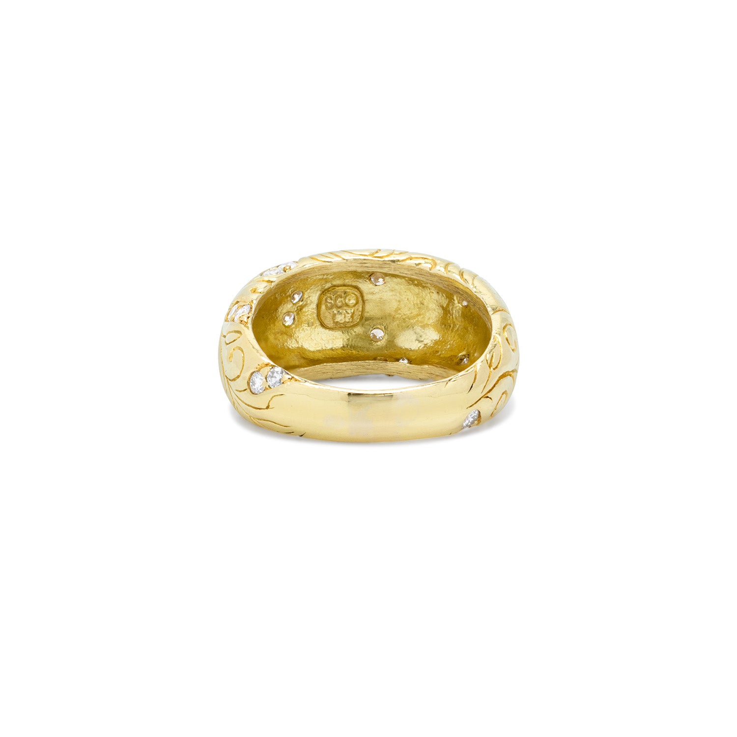 A striking example of timeless elegance, this Seidengang ring is crafted in luxurious 18k gold and set with brilliant-cut diamonds. Known for their sculptural designs inspired by classical antiquity, Seidengang pieces blend old-world influence with modern sophistication. The gold has a rich, velvety finish that highlights the textural detailing, while the diamonds add subtle sparkle and refinement. Light wear is visible from age, including a few small silver-toned spots on the back of the band—likely from past soldering or minor tarnish. An exquisite statement piece with enduring style—perfect worn alone or layered with your favorite heirlooms. Currently a size 8 1/4. Resizing available upon request (1-2 week lead time).
