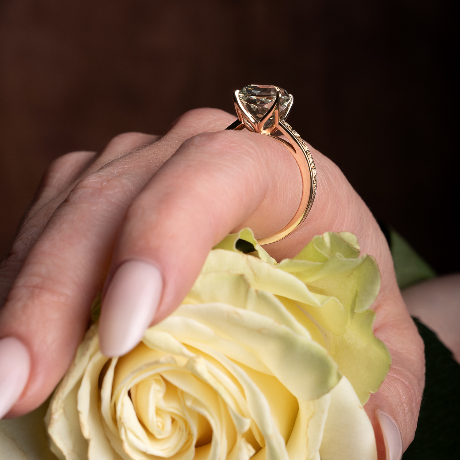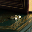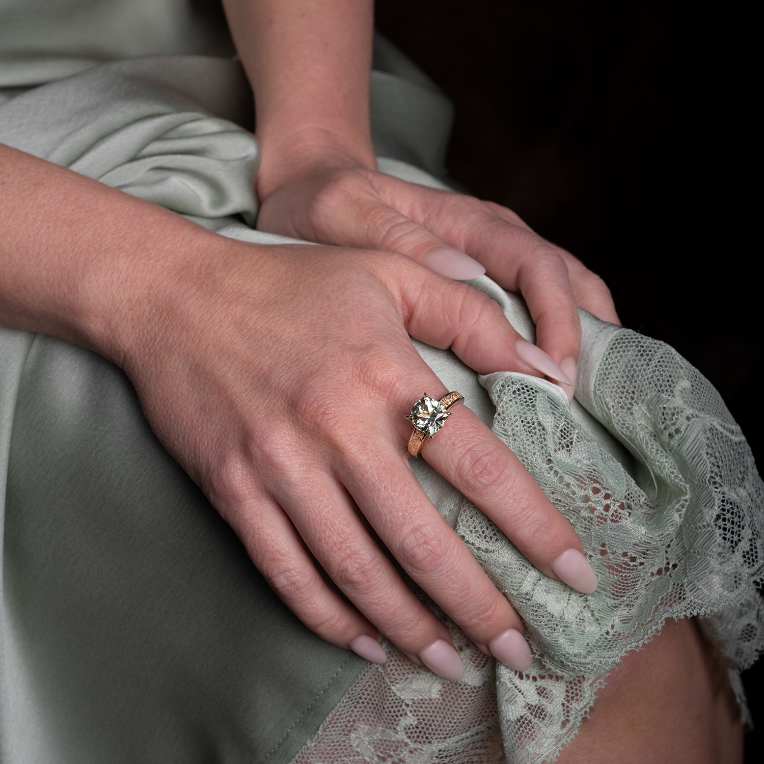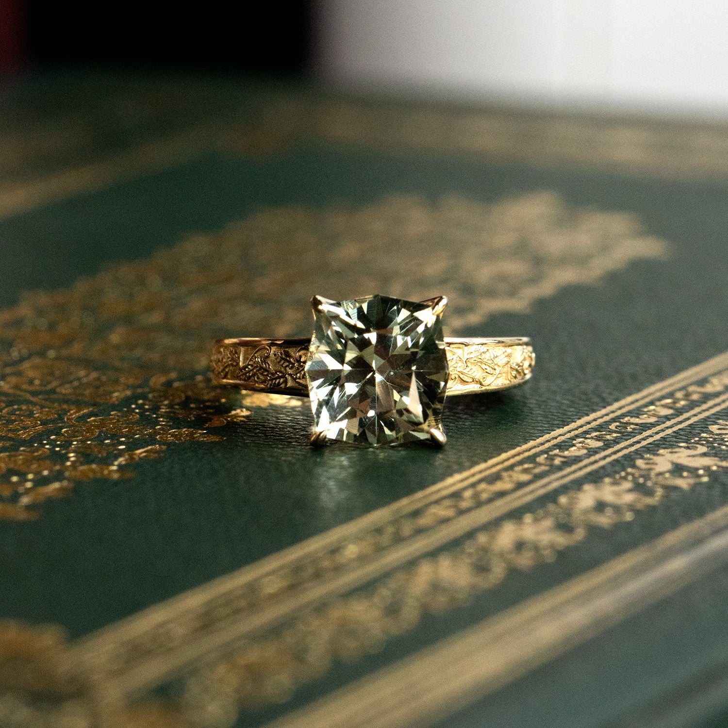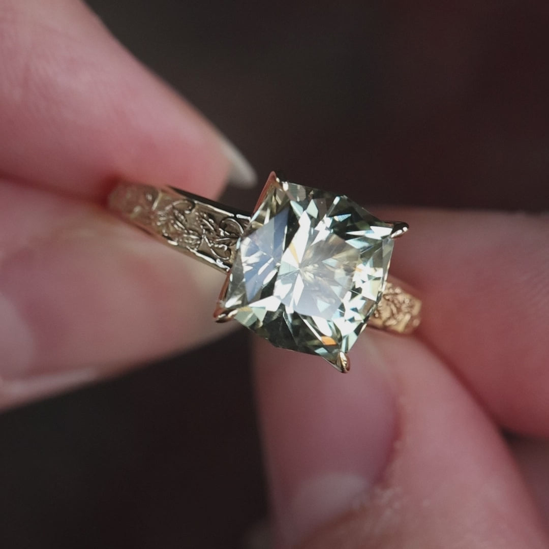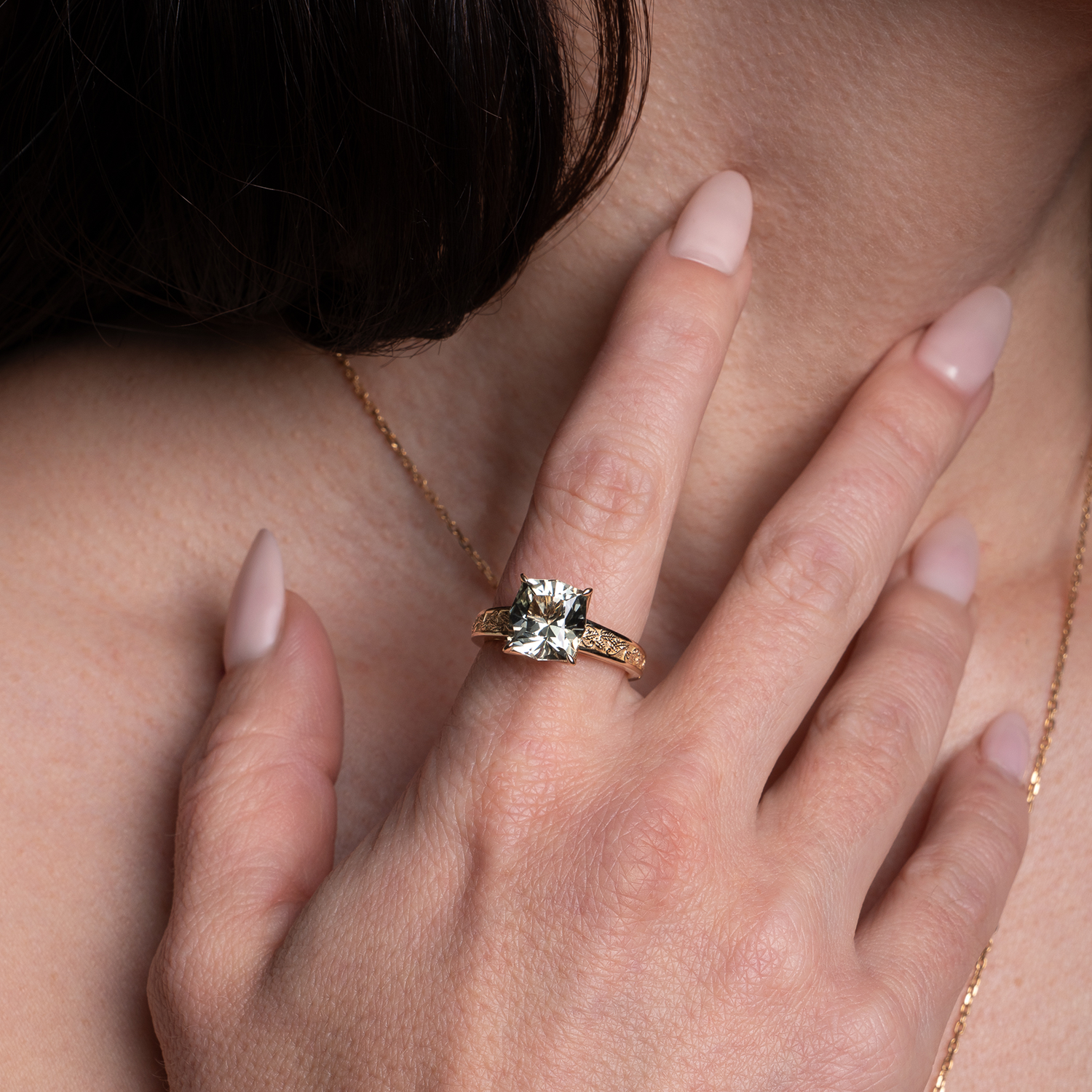 The Sylvan Ring is an ode to elven and fairy magic — light, airy, and quietly enchanting. At its center is a 3.71ct master-cut prasiolite in a rare Pentagon Cushion shape, glowing in soft mint green. The stone sits in a petal-shaped crown, with leaves and vines carved into the band for an organic, storybook feel.