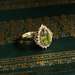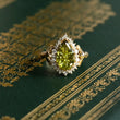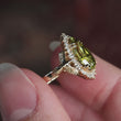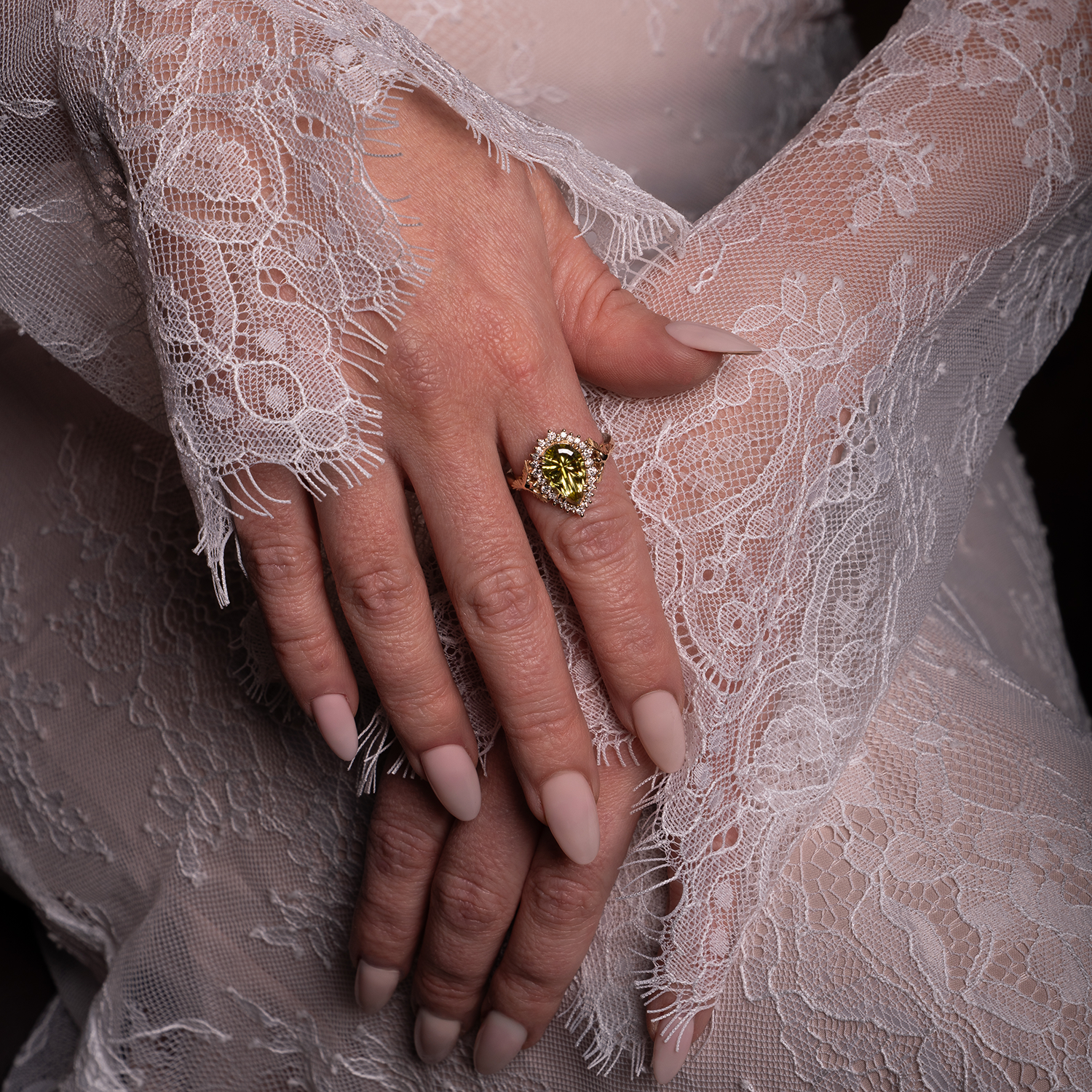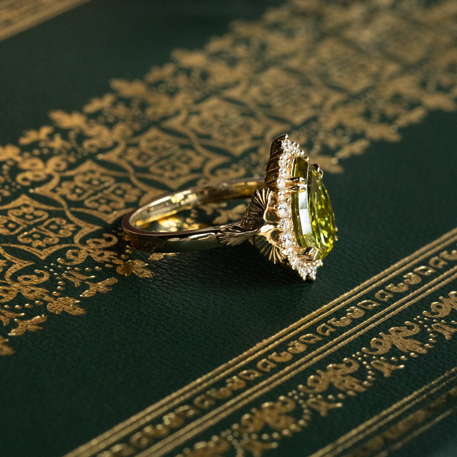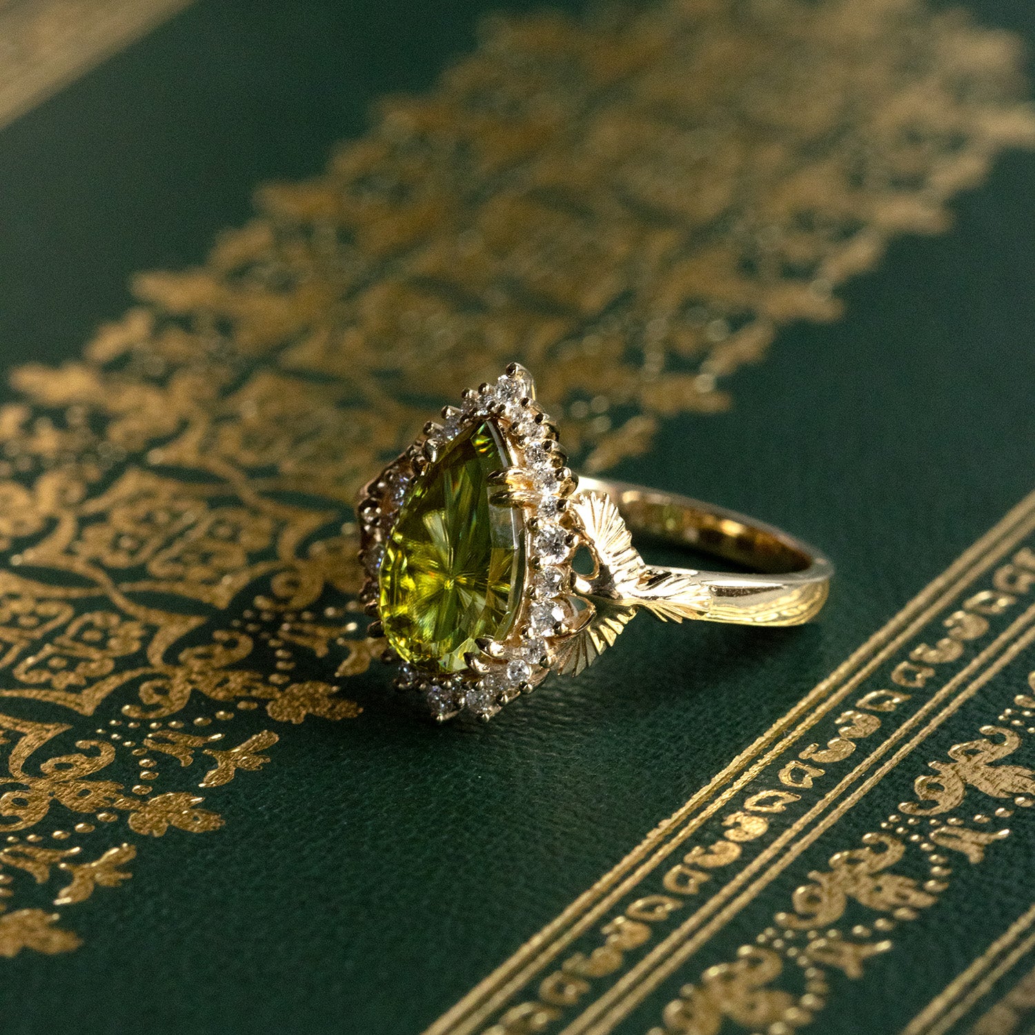 This ring features a 3.54ct John Dyer StarBrite–cut sphene from Zimbabwe, glowing with radiant green tones, beautiful brilliance, and lively fire. A soft lab-diamond halo frames the center stone, adding light while letting the sphene stay the focus.