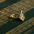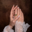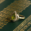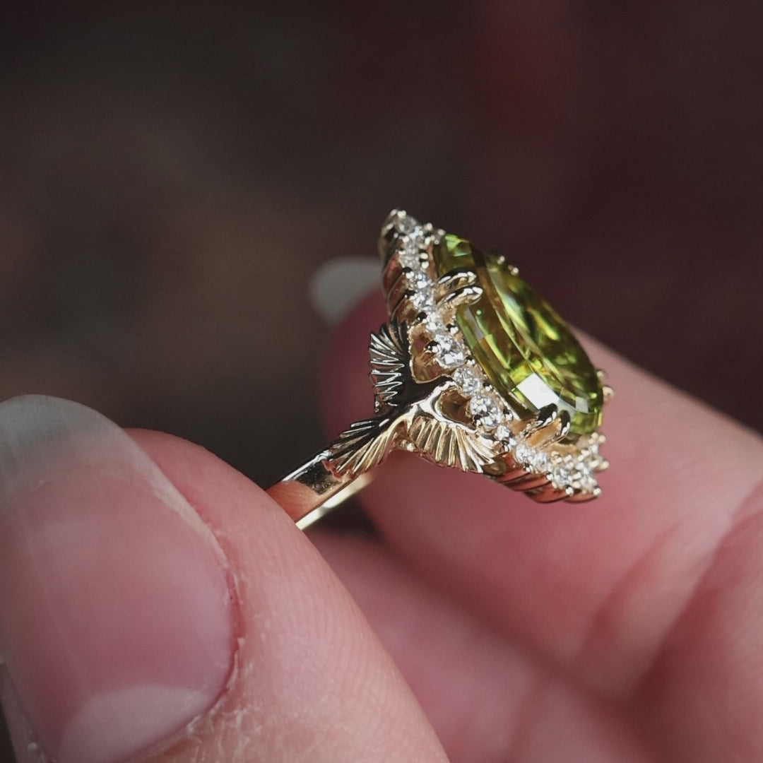 Two small birds perch along the sides — a gentle detail meant to capture the feeling of a free spirit moving through fresh spring leaves. Set in 14k gold, the ring is a size 8 and can be resized; please allow 1–2 weeks.